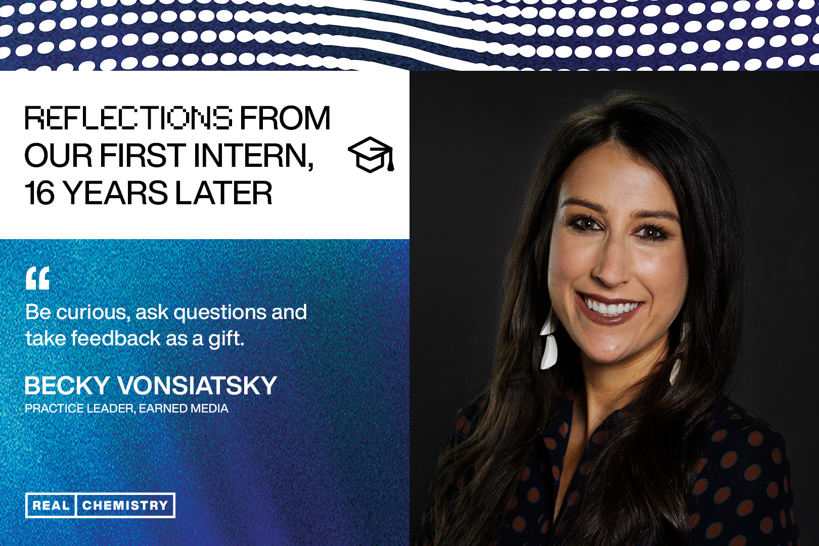 As our 2022 summer interns begin this week, we’re excited for their journeys full of learning, connection and self-discovery. Who better to share advice and experiences with them than Becky Vonsiatsky, Practice Leader, Media & Engagement, and Real Chemistry’s first intern nearly 16 years ago?