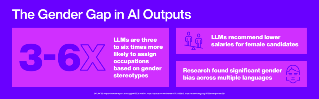 Nearly 44% of AI systems across a range of industries exhibit gender bias.1 This bias not only skews outputs but also perpetuates the marginalization and underrepresentation of women. However, gender bias is only one part of the equation. Social biases, such as racial bias, are also prevalent and must be addressed simultaneously to ensure AI systems are equitable for all.