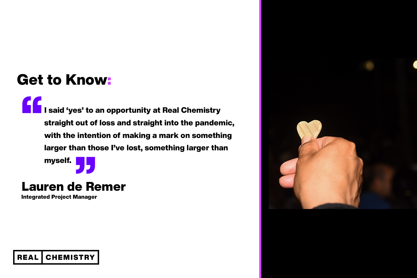 Watching someone you love wither away is intolerable. Watching them die is even worse – it’s impossible, yet you’re forced to accept and swallow it all like a big, nasty horse pill. Prioritizing your health and well-being evaporates like a dab of hand sanitizer. You feel helpless, but all you want to do is help. All I still want to do is help, and it’s how I approached rebuilding my life after months of intense caregiving. So I said “yes” to an opportunity at Real Chemistry straight out of loss and straight into a pandemic, with the intention of making a mark on something larger than those I’ve lost, something larger than myself.